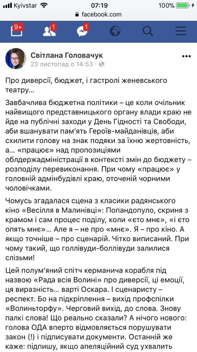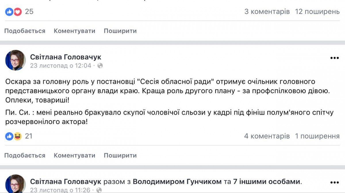 23 листопада під час сесії обласної ради Світлана Головачук «народила» одразу кілька дописів. У них «головний політтехнолог» очільника ВОДА глузує з окремих обранців громади і голови облради Ігоря Палиці, називаючи розподіл бюджетного перевиконання «постановкою», та навіть бере на себе роль жюрі, присуджуючи Оскар та інші мистецькі нагороди. Знаково, що державний службовець так чудово цитує класиків радянського кінематографу і крилаті вирази тих років, які надають комуністичному періоду особливого забарвлення.
