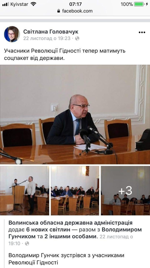 Про якість роботи і відкритість самої обласної державної адміністрації красномовно свідчать останні події, організовані відомством Світлани Головачук. Про яку публічність і створення позитивного іміджу центральної влади та президента можна говорити, коли на зустріч із учасниками Революції Гідності на Волині до губернатора прийшло усього 15 людей! Держслужбовець радісно поділилась світлиною з цього заходу, гордо прокоментувавши допис: «Учасники Революції Гідності тепер матимуть соцпакет від держави».Напевно, на думку прес-секретаря Гунчика, у Революції Гідності з Волині брали участь лише до 15 осіб. Чи, можливо, на зустріч були запрошені лише «потрібні» люди, адже інформації у вільному доступі про сам захід журналістам знайти не вдалося. Можливо, це пов’язано зі страхом громадськості і несприйняттям постаті самого губернатора, якого у 2014 році після скандального призначення активісти гнали вулицями міста і кинули яйцем. За це громадськість дала йому кличку «Гунчик-побігунчик» та удостоїли почесної відзнаки – «Золотих кросівок».До речі, на сторінці довгоногої красуні Світлани Головачук у Фейсбук вказано, що раніше вона працювала у редакції «Волинської газети», з якою у Володимира Гунчика 2 роки тривала судова тяганина. Губернатор всупереч Закону України «Про реформування державних і комунальних друкованих засобів масової інформації» від 24 грудня 2015 р. та Постанови Кабінету міністрів України №848 від 23 листопада 2016 р. відмовлявся підписувати передбачену статтею 7 угоду, чим заважав роздержавленню видання.«Можливо, Володимир Петрович зрозуміє, що ганебна поведінка його підлеглої не сприяє формуванню позивного мікроклімату в середовищі волинської влади та заважає налогодженню продуктивного діалогу між виконавчою гілкою влади і найвищим представницьким органом Волині. Губернатор повинен зробити з цього інциденту потрібні висновки та покарати свого прес-секретаря за "тролінг" і недостойну жінки та матері поведінку, а держслужбовець уникне подібних помилок у майбутньому і з повагою почне ставитися до звичайних громадян», - підсумовують журналісти.