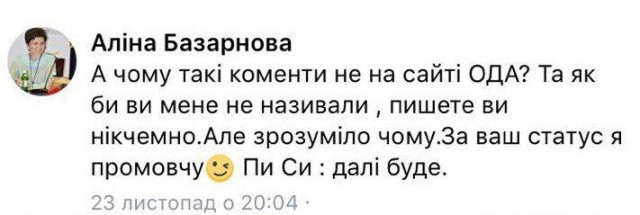 Я не знайомий з Аліною Базарновою, але підтримую її на 101%. Мені соромно читати такі "тексти" від працівниці влади, державного службовця. Таке враження, ніби цей мотлох писав секретар Остапа Бендера. Все в одному нужнику: Оскар, весілля в Малинівці, профспілкова діва. Чи має право таке нещастя, як головачук, ображати людей, представницьку владу області, депутатів? А мова яка... Погана мова як незастебнуті штани, і з них щось виглядає. Гунчик зі своєю секретуткою досягнув дна, і в тому дні головачук ще копає йому яму.