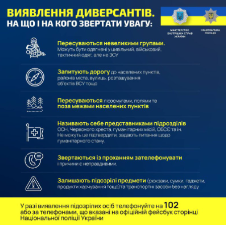 За інформацією МВС диверсанти зазвичай пересуваються поза межами населених пунктів невеликими групами, розпитують дорогу та розташування ЗСУ, часто просять зателефонувати. Крім того, ворог може залишати підозрілі предмети (одяг, ґаджети, рюкзаки та навіть авто) і називати себе представником різних структур (ООН, Червоного Хреста, ОБСЄ тощо).