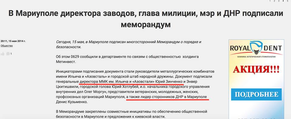 "Юрій Зінченко крім іншого запам'ятався тим, що в травні 2014 року разом з мером міста Хотлубеєм і директором іншого ахметовського комбінату "Азовсталь" підписував спільний меморандум з бойовиками ДНР. В якому просив "київську владу" (тобто, нібито чужу, не маріупольську) прибрати від Маріуполя блокпости ЗСУ і передати контроль над в'їздами в місто місцевій міліції. Нагадаю, що маріупольські менти в той час співпрацювали з сепаратистами і не заважали їм влаштовувати в місті погроми і грабежі", - продовжує журналіст.