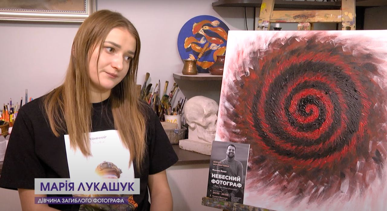 «Біль втрати» – так свою картину назвала Марія Лукашук, дівчина відомого волинського «небесного фотографа». Її Максима Бурди не стало в січні цього року під Бахмутом. Виставка його воєнних фотографій об’їхала вже дев’ять міст України. На згадку про коханого та всіх полеглих на війні мрію Максима реалізувала його кохана.