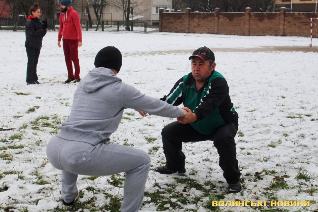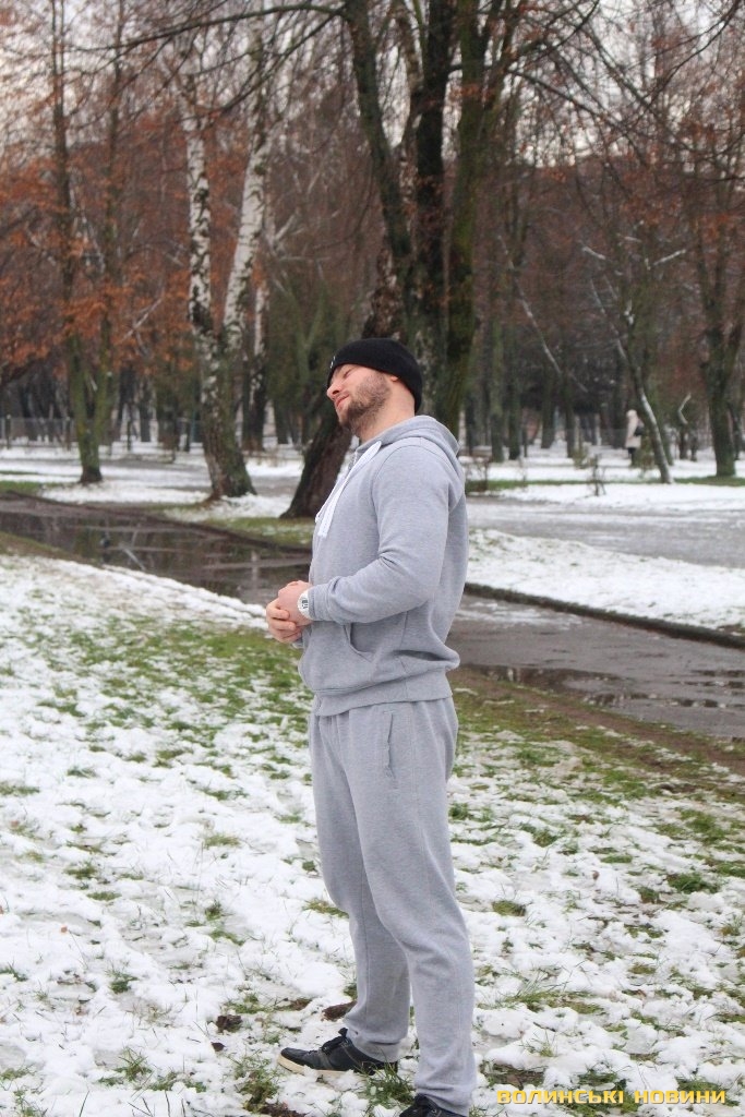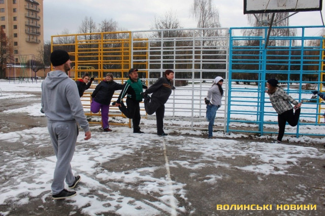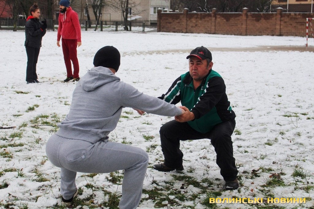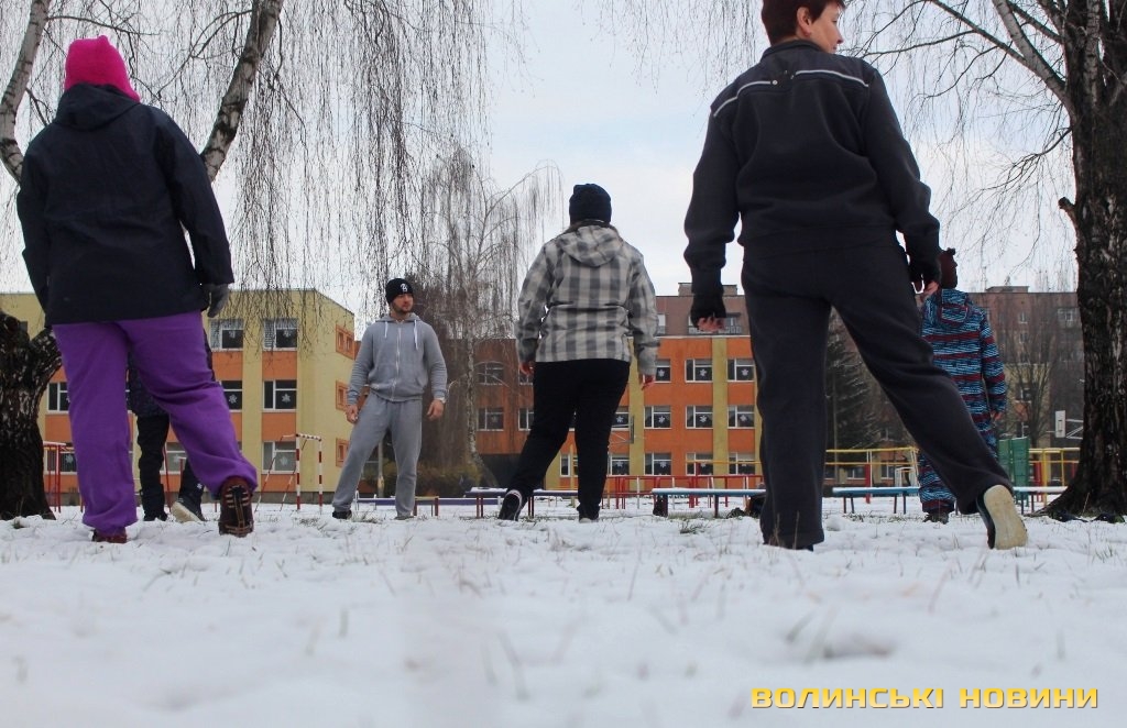Незважаючи на завзяття спортсменів погода все ж внесла свої корективи у їхній план, тож врахувавши стан доріжок покритих льодом, цього разу обійшлися без бігу, проте компенсували його вправами.