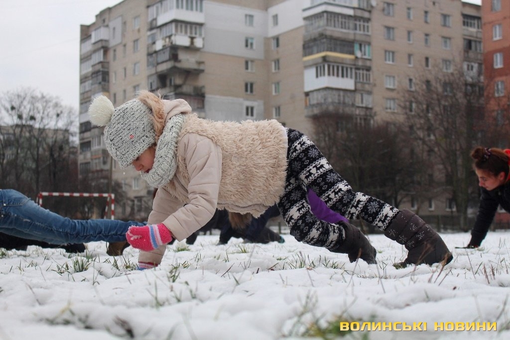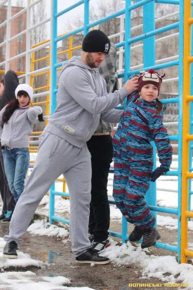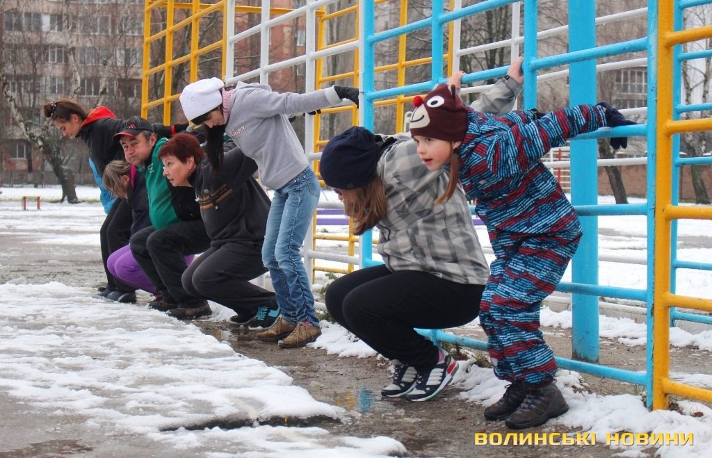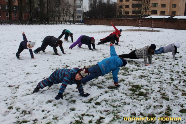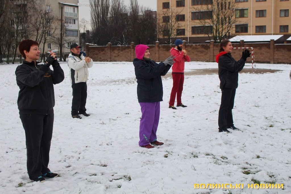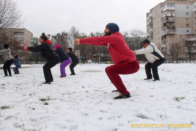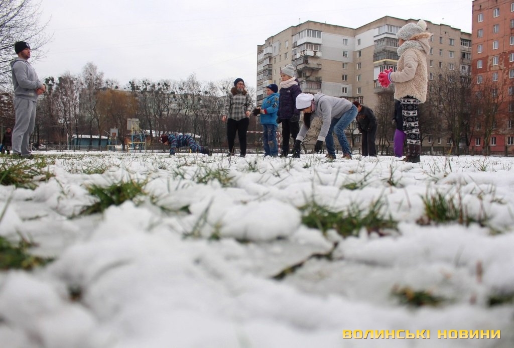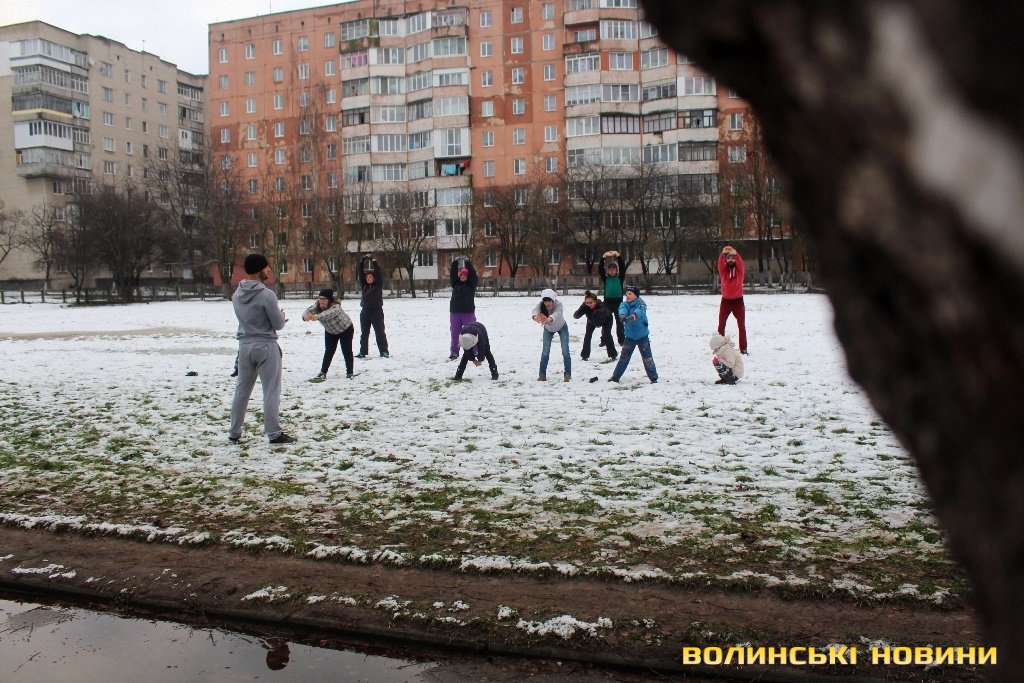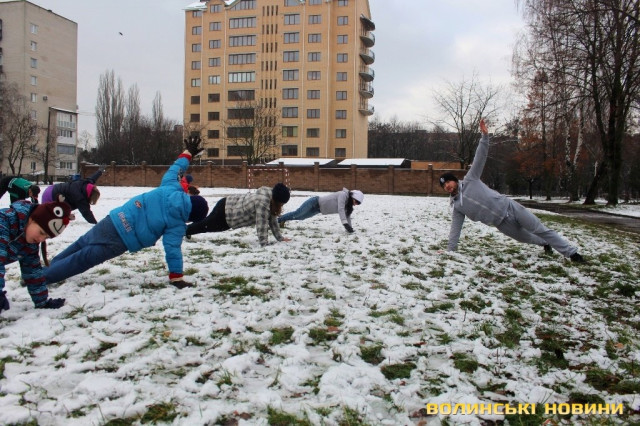 Спортсмени уміло виконували вправи, оскільки зібралися постійні учасники недільної акції. А діти встигали всюди: і підхід виконати, і сніжкою поцілити, і проламати тоненький лід у мілкій калюжі;)
