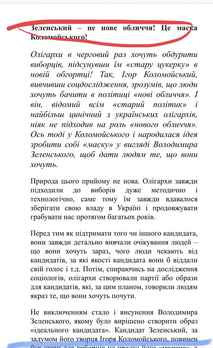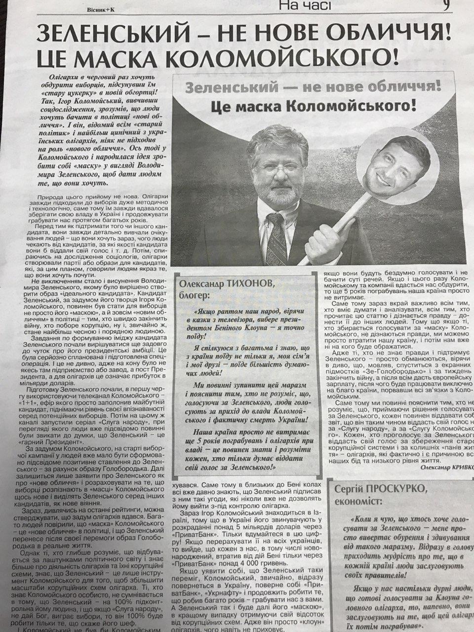 Директор ТОВ «Обрії 1919» Костянтин Григоренко розповідає, що днями одне з рекламних агентств звернулося до нього та інших колег-редакторів із пропозицією розмістити чорний піар про одного з кандидатів у Президенти України, а саме Володимира Зеленського.
