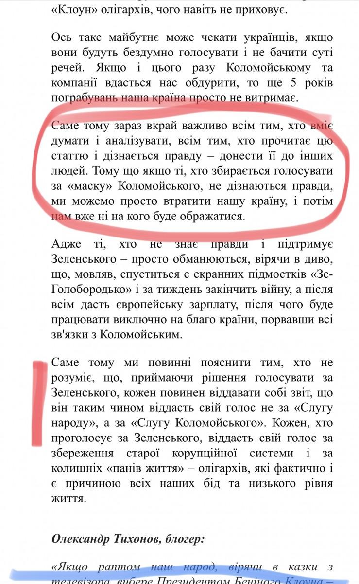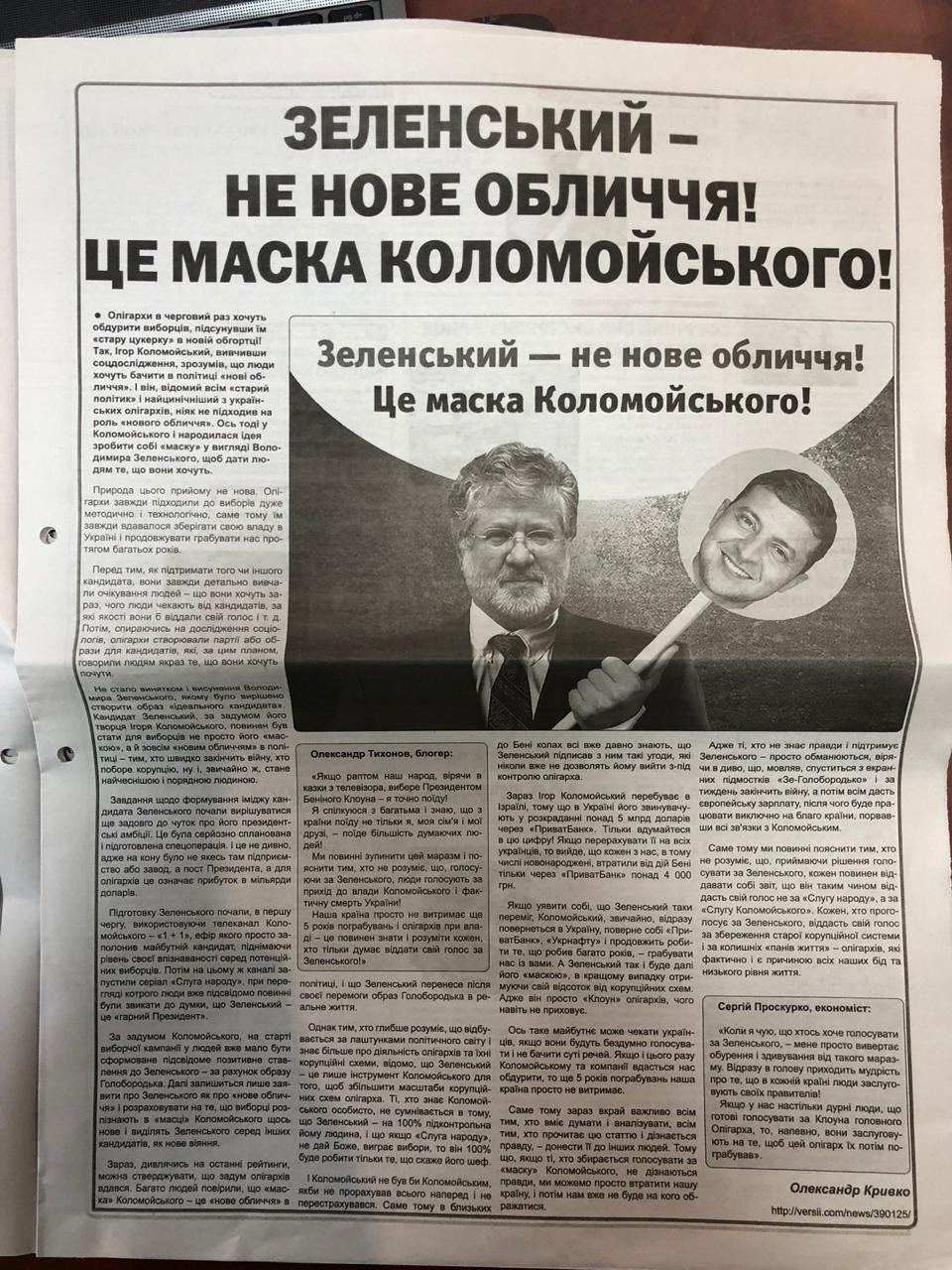 Та додає, що будь-який наклепницький матеріал може оскаржуватись в суді. Натомість юристи Зеленського мають підстави звернутись в редакції газет з вимогами щодо спростування. «Маємо зупинити хвилю бруду проти всіх кандидатів. Не можна публікувати брудні замовні матеріали ні про Тимошенко, Порошенка чи про якогось іншого кандидата, даючи контр-агітаційні матеріали під прикриттям», – пояснює він.