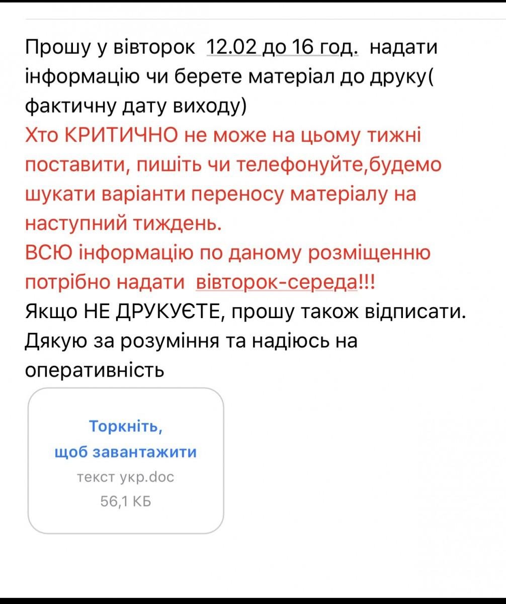 «Перші дзвінки прийшли з Волині. Зараз ми перевіряємо інші газети, бо саме в середу-четвер виходять свіжі номери. Враховуючи, що і по інших областях були пропозиції розмістити цей текст, можна говорити, що це масована атака на кандидата», – розповідає Томіленко та додає, що розміщаючи відверто маніпулятивні тексти газети, фактично, продають свою репутацію.