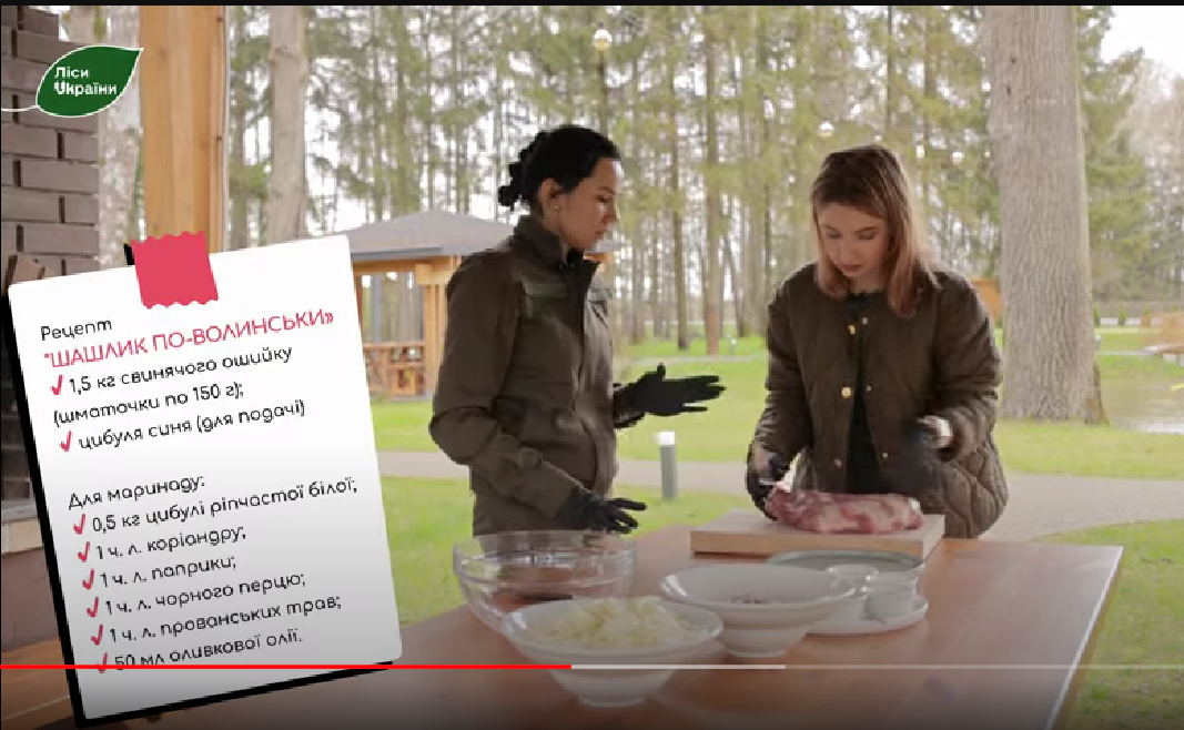Фішкою проєкту стало готування регіональних страв. Так, глядачам продемонстрували рецепт «Шашлику по-волинськи». М’ясо шматками смажать на тандирі (східна керамічна піч у формі великого глечик, – ред.). До того його маринують 2,5 години в цибулі та спеціях.Як наголосила Ксенія Григор’єва, рекреаційних пунктів для відпочинку на природі є чимало на Волині та по всій Україні. Для зручності лісівники розробили спеціальну мапу ознайомитися з якою можна за покликанням.