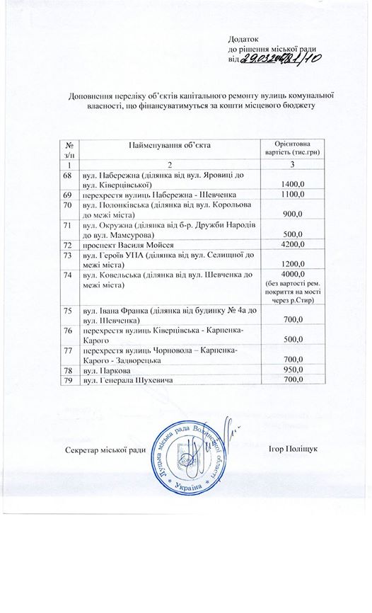 Зі слів директора департаменту ЖКГ Юрія Крася, до переліку пропонується внести такі дороги, як Набережна, Полонківська, Окружна, Героїв УПА, Ковельська, Івана Франка, Паркова, Шухевича, проспект Василя Мойсея. З його слів, ці вулиці не перебувають на гарантійному обслуговуванні.