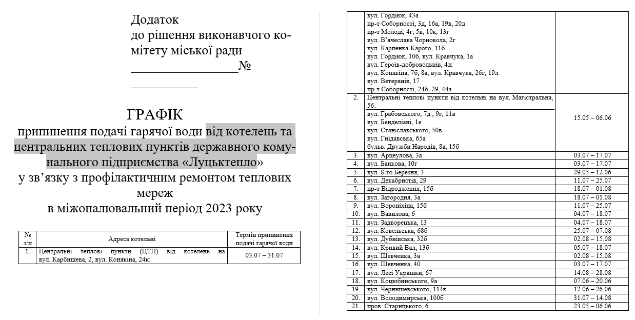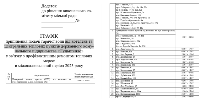 У Луцьку затвердили графік припинення подавання гарячої води в міжопалювальний період 2023 року у зв’язку з профілактичним ремонтом теплових мереж.