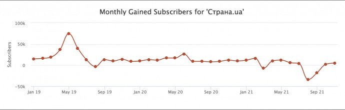 Натомість канал «Страна.ua» залишається лідером у сегменті «Медіа». Втім його ефективність зменшилася. Сумарні перегляди відео за останні три місяці склали 17 млн проти 23,5 млн рік тому. Найпопулярніші відео в 2021 році – «Удар на Киев и «котёл» на востоке. Сценарии войны» та «Война на Донбассе и отношение с Россией» (по пів мільйона переглядів).