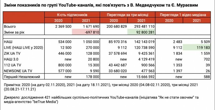 За останні три місяці 2021 року їх сумарні перегляди склали майже 300 млн при аудиторії 1,7 млн. Основними є НАШ та LIVE – на обох транслюють програми з телеканалу НАШ. На них припадає 90% показників проросійської групи.Найбільша ефективність у каналу LIVE (колишній НАШ LIVE). Рік тому в нього було 12 500 підписників та 9 000 переглядів за три місяці. Зараз аудиторія – 270 000, а середні перегляди одного відео – 120 000. Найпопулярніше відео «ЧУЄШ, ПРИДУРОК – Гончаренко покинув студію після слів Шуфрича» (1,7 млн переглядів).