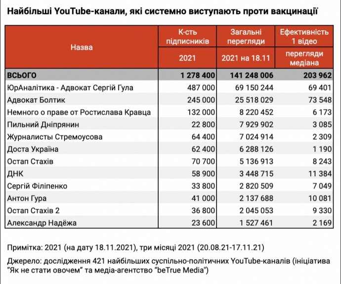 Проте на українську аудиторію системно працюють лише 12 великих YouTube-каналів. Їх сумарна аудиторія – 1,3 млн, а перегляди за останні три місяці – 40 млн. Це близько 2% від всіх переглядів на 421 досліджуваному каналі. Решта відео – або російські канали, або відео з невеликих каналів.Найбільш медійний лідер антивакцинаторського руху Остап Стахів – знизу таблиці популярності. Два його однойменні канали мають аудиторію 100 000, а перегляди за три місяці – 3,4 млн. Середні ж перегляди одного відео – близько 10 000.