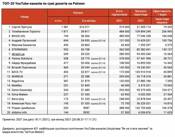Російським грошам протистоять українці, які фінансують свої улюблені канали. Тільки через Patreon понад 12 000 українців підтримують 50 топових каналів на понад 2,3 млн грн щомісячно. Відео цих каналів набирає під 70 млн переглядів щомісяця.Канал BIHUS info входить у трійку тих, кому українці донатять на Patreon найбільше. Він один з лідерів і за зростанням у 2021 році (за період з листопада 2020 по листопад 2021-го). Його аудиторія та середні показники перегляду – до 490 000 підписників та понад 166 000 переглядів (тут і далі середнє, розраховане як медіана).