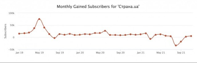 Середнє ж відео набирає 88 000 переглядів, як на каналі Сергія Притули, що має значно меншу аудиторію. За даними сервісу Socialblade, «Страна.ua» втрачає аудиторію. Наприклад, протягом липня відписалося 34 000, а в серпні ще 18 000 людей.У 2020 році сумарні перегляди проросійських YouTube-каналів (112, Zik, Newsone, НАШ) за три місяці перевищували 200 млн, а аудиторія – 2,4 млн. Проте після блокування у квітні каналів 112, Zik, Newsone показники проросійського пулу тільки зросли.