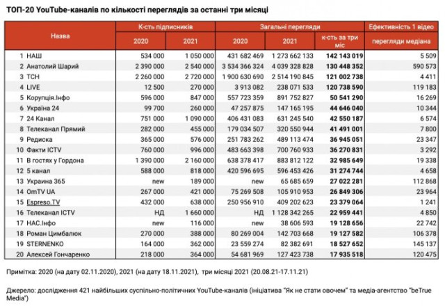 Серед українських медіа найкращу ефективність показує канал «Цензор.НЕТ», який з минулого листопада збільшив аудиторію вчетверо, а середні перегляди відео виросли з 8 000 до 44 000.Не для всіх українських ютуберів 2021-й був успішним. Два блогери-політики Сергій Притула та Гео Лерос, які вдало стартували торік, показали суттєве зниження середніх переглядів відео. Хоча і збільшили кількість підписників.