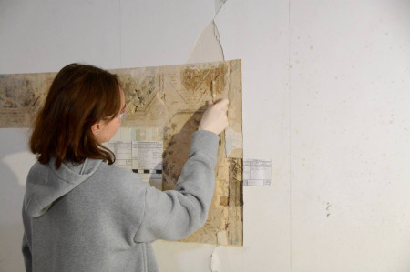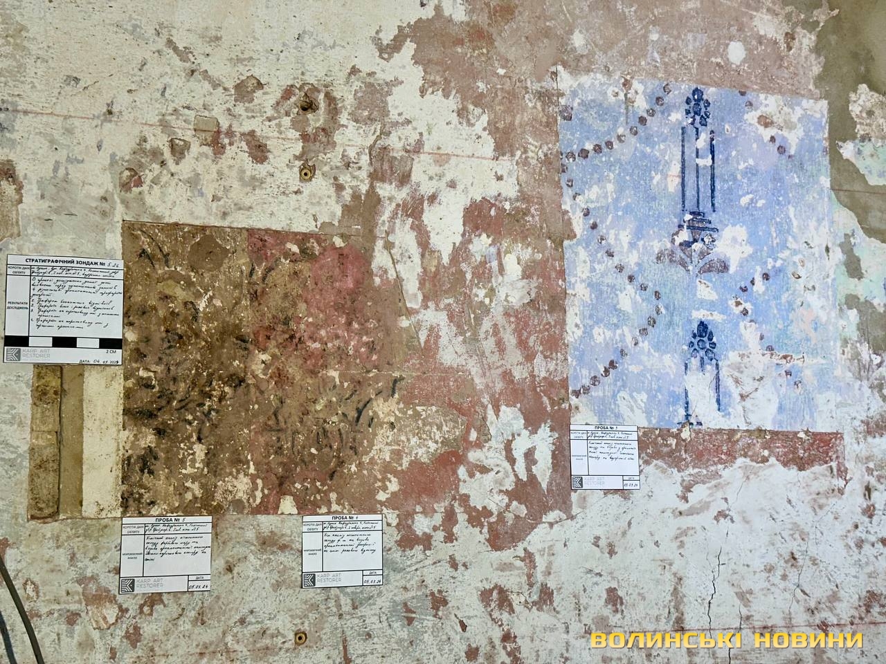 Уже віднайдені певні історичні декорації, кольори. На основі цих досліджень у подальшому можна буде формувати концепцію та розробляти проєктно-кошторисну документацію», – прокоментував художник-реставратор, засновник реставраційного бюро KARP Restorer Василь Карпів.Детальніше про виявлені знахідки розповіла художниця-реставраторка бюро KARP Restorer Ірина Змієвська.«Найбільше декоративних оздоблень стін ми знайшли під час дослідження першого поверху будівлі. В основному це трафаретні декорації. Деякі декорації помітні при денному світлі. Деякі під впливом часу, пошкоджень, пізніших нашарувань стерлися і їх можна дослідити тільки за допомогою ультрафіолету. Щодо нашарувань, то ми нарахували близько дев’яти, а в деяких місцях навіть до чотирнадцяти шарів поверх перемальованих записів. Останні шари – це трафаретні декорації.