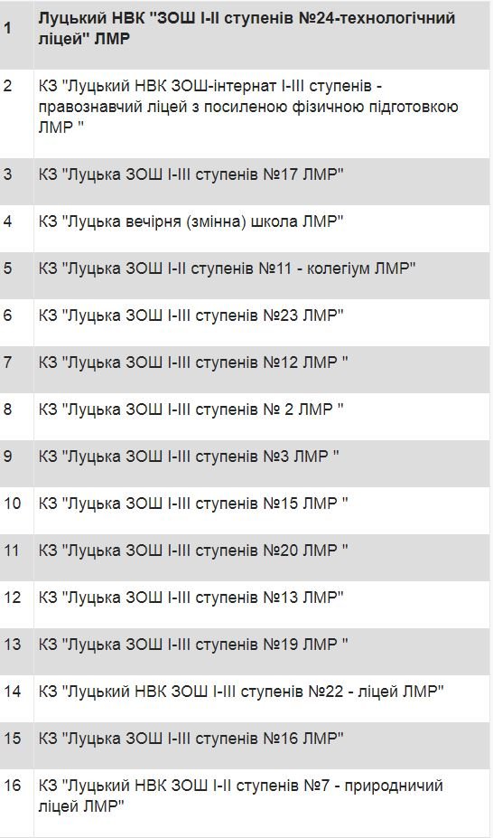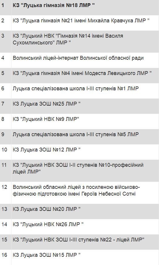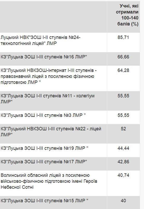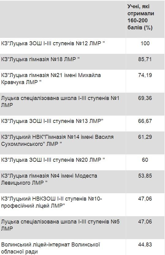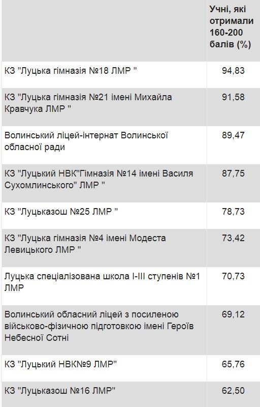 На основі даних, оприлюднений по кожній зі шкіл Луцька, сформовано рейтинги навчальних закладів за кількістю учнів, що набрали найвищі бали. Також показаний антирейтинг шкіл, де найбільший відсоток учнів, що набрали найнижчі бали, пише Конкурент.