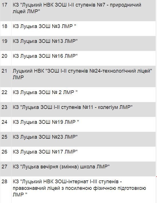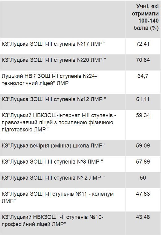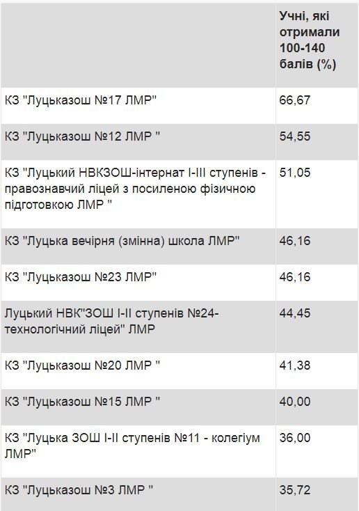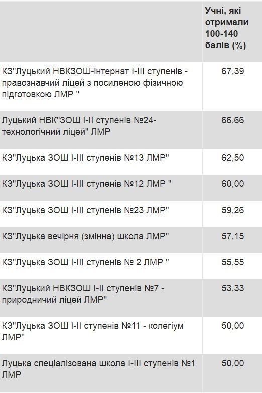 У розрізі луцьких шкіл найбільші відсотки учнів, що не подолали поріг тестування, є у школах №№ 13, 15, 17. Щодо тестування з історії України, то школи №№ 12, 13, 15, 16, 17, 19 та 23 мають найбільший відсоток учнів, що не подолали поріг. З математики такі дані за школами №№ 2, 3, 15, 17, 19, 20, 23 та правознавчим ліцеєм з посиленою фізичною підготовкою. З англійської мови найбільше учнів, що не подолали поріг, у школах № 2, 3, 11, 16, 17, 19, 20, правознавчому ліцеї з посиленою фізичною підготовкою. Традиційно великі відсотки неподолання порогу з усіх предметів в учнів луцької вечірньої школи.
