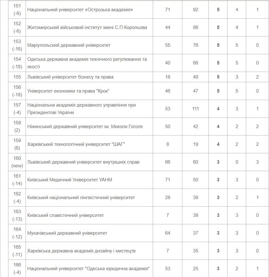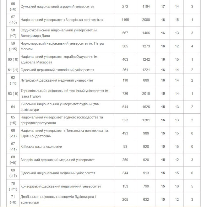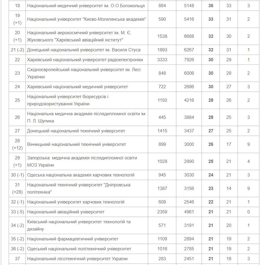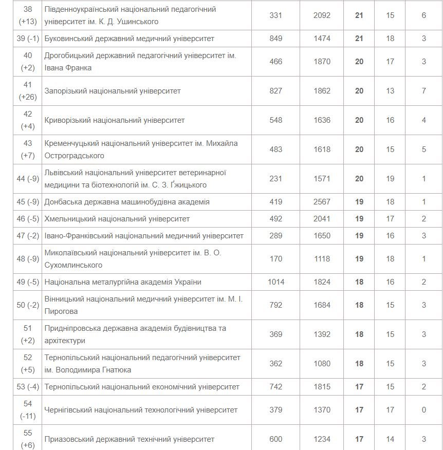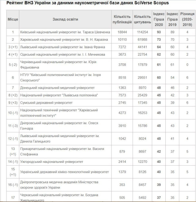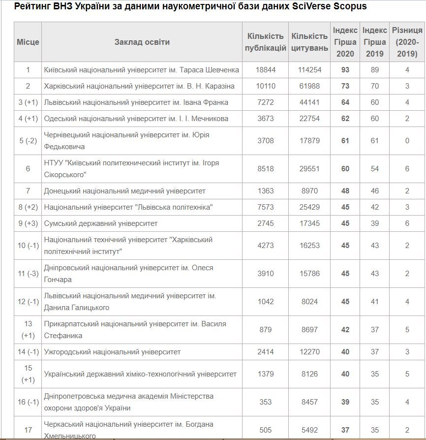 У рейтинговій таблиці вищі навчальні заклади України ранжовані за індексом Гірша — кількісним показником, що базується на кількості наукових публікацій і кількості їх цитувань.