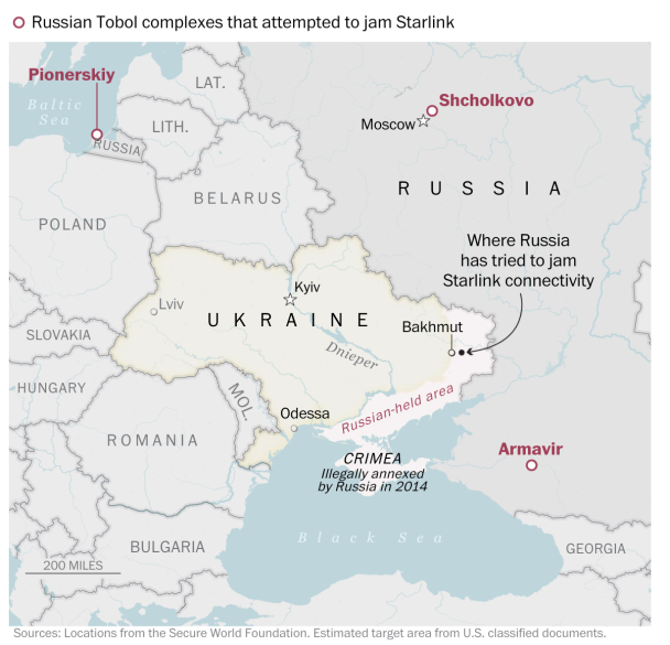 За даними видання, Москва місяцями експериментувала зі своїми системами радіоелектронної боротьби «Тобол», намагаючись порушити передавання даних Starlink в Україні.