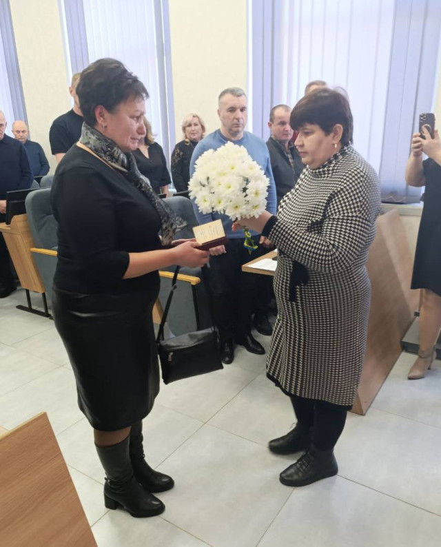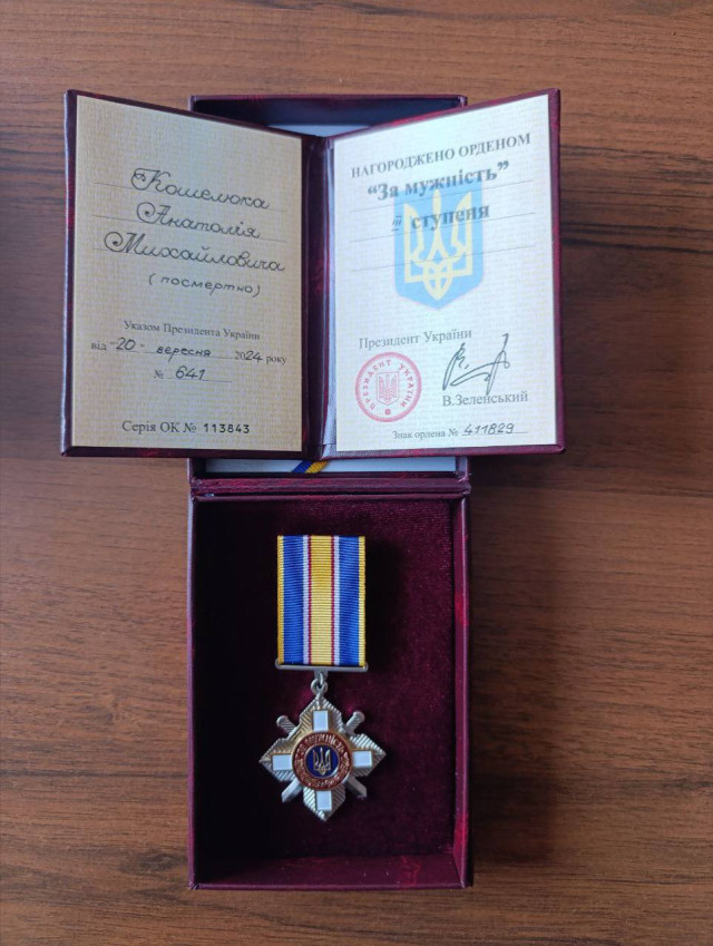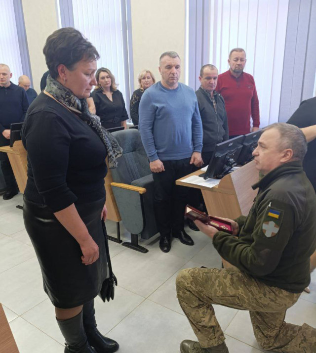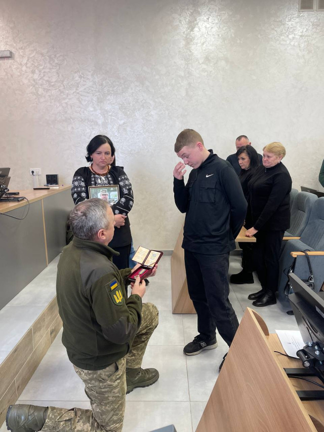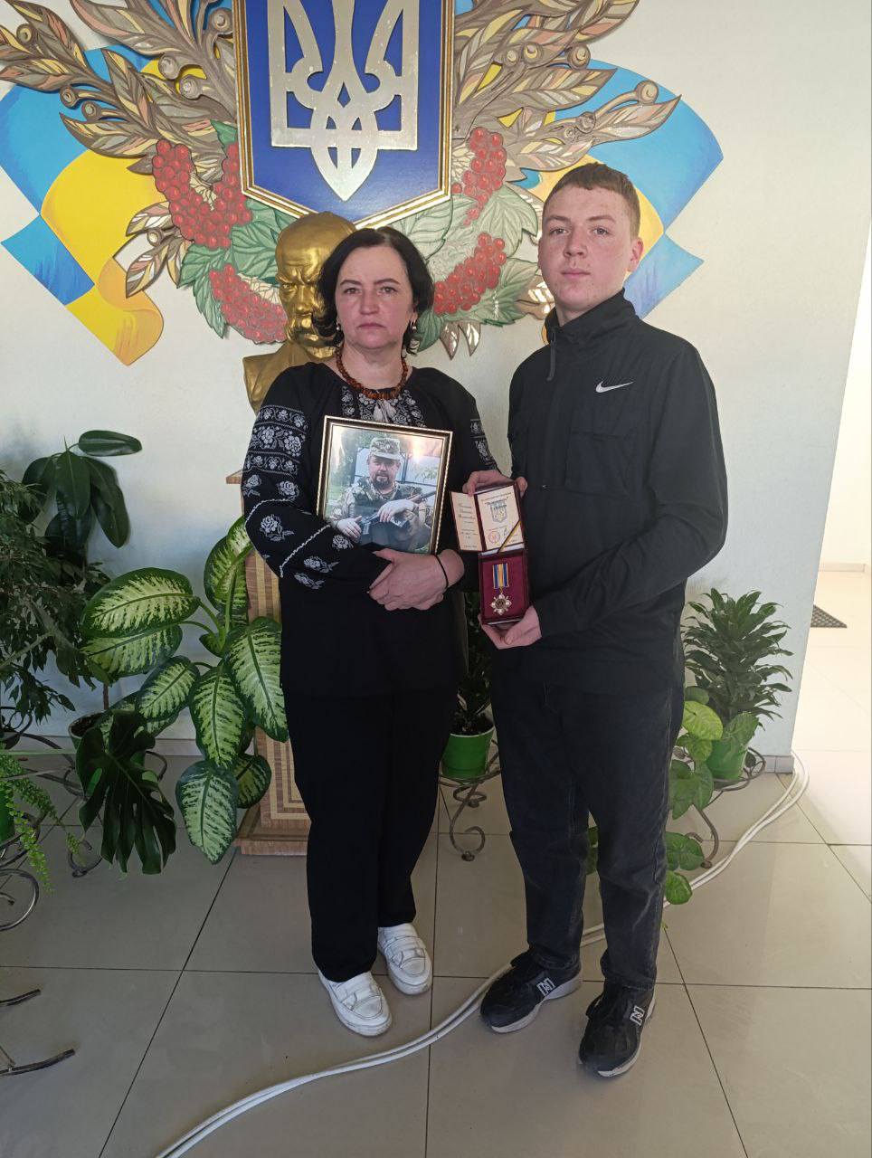 Державну нагороду від Президента України за вірність військовій присязі, відважність, проявлену у захисті територіальної цілісності держави представник ТЦК передав дружині загиблого захисника – Вікторії Кошелюк та сину воїна.