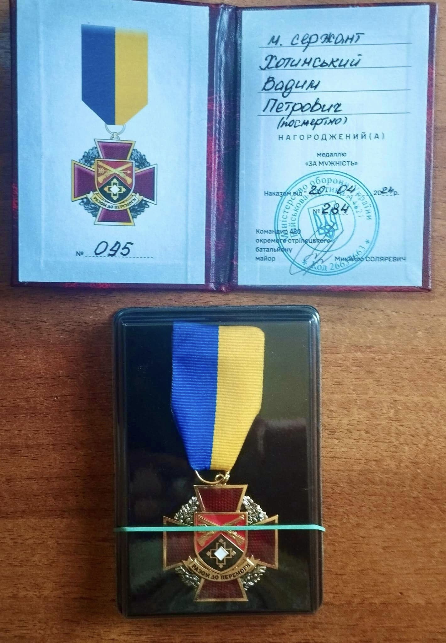 Медаллю «За мужність» від командира 420 окремого стрілецького батальйону нагороджено посмертно Хотинського Вадима Петровича, нагороду вручено брату померлого військовослужбовця.