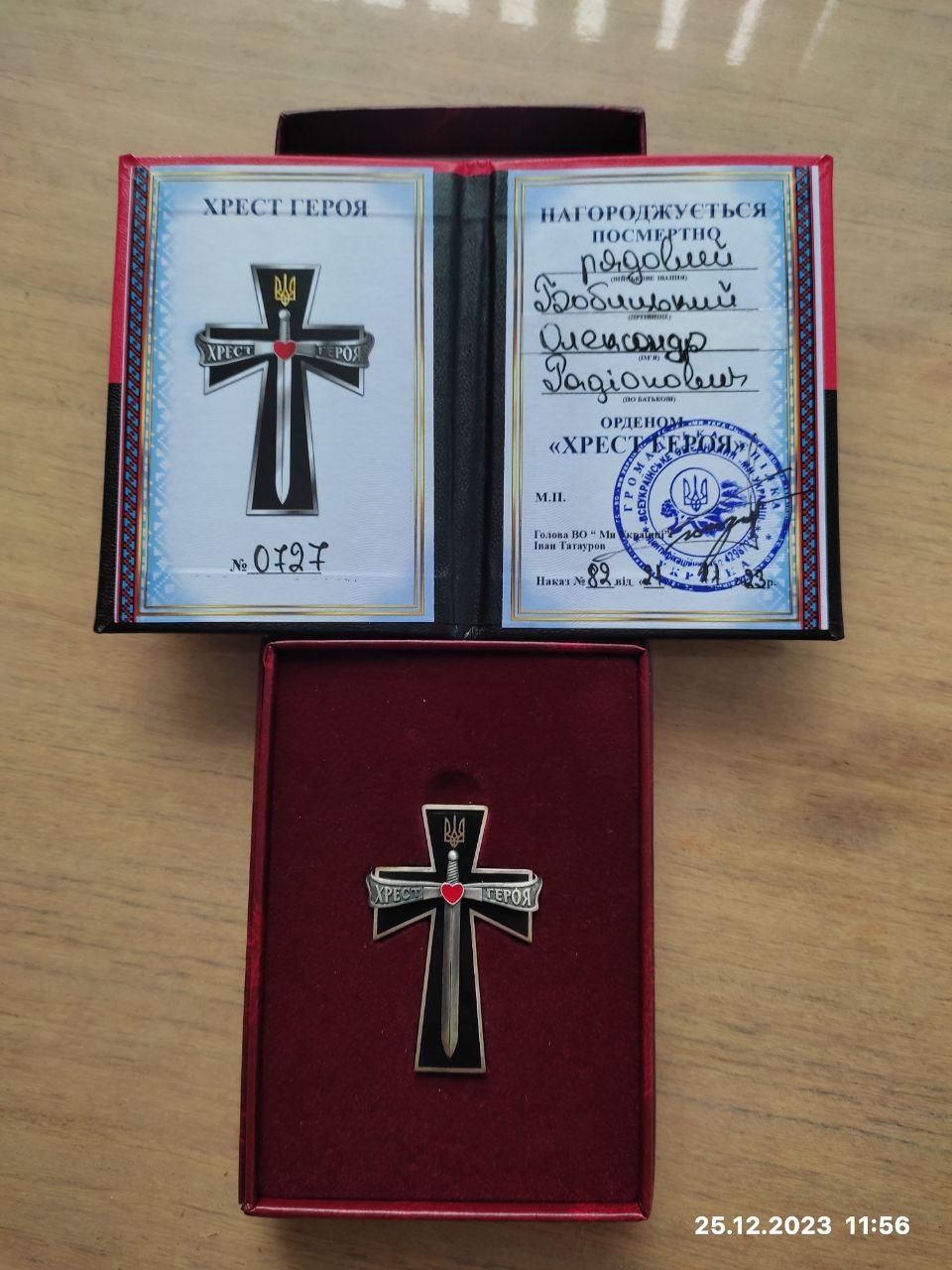Наказом Голови ВО «Ми Українці» І.Татаурова № 82 від 21.11.2023 року волинянина, який віддав своє життя за Незалежність та Суверенітет нашої Держави, Бобицького Олександра Родіоновича нагороджено орденом «Хрест Героя» посмертно.