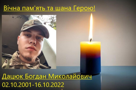 Богдан Дацюк народився у селі Вільхівка 2 жовтня 2001 року. Він був хорошим сином, товаришем, побратимом.