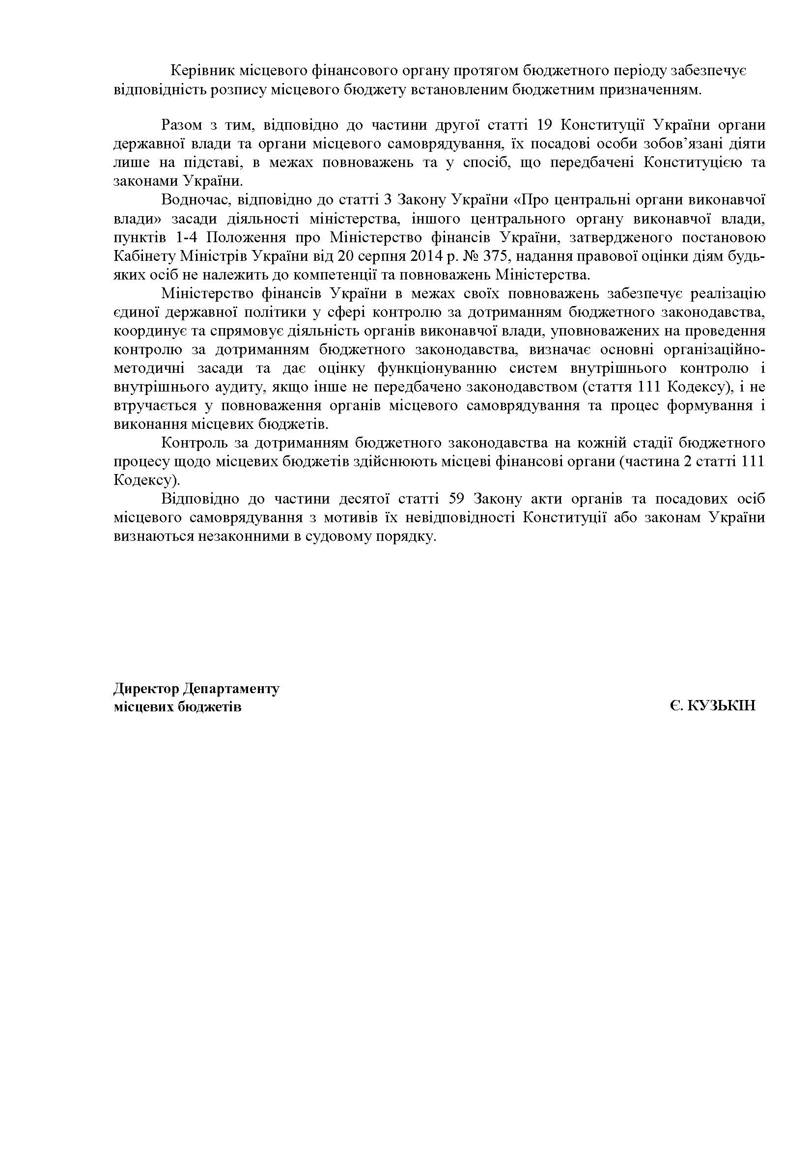Посилаючись на українське законодавство, в Мінфіні нагадують, що до повноважень рад належить затвердження та контроль за виконанням обласного бюджету, а в компетенції ОДА – складання та виконання. Також в Мінфіні пишуть, що місцевий бюджет виконується за розписом, затвердженим керівником місцевого фінансового органу.