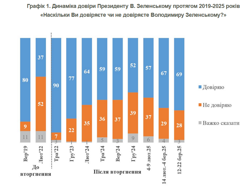 Станом на другу половину березня 2025 року 69% українців довіряють Президенту Володимиру Зеленському.