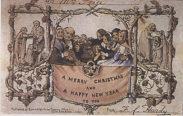 Коул доручив Джону Калькотту Хорслі намалювати листівку. На ній зображені бідняки, які отримують їжу й одяг від доброчинців. У центрі поштівки – щаслива родина святкує, обіймаючись. Люди смакують вино.