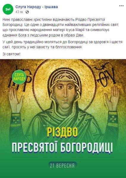 На Закарпатті осередок партії «Слуга народу» вирішив привітати українців з Різдвом Пресвятої Богородиці, наклавши свій логотип на ікону.