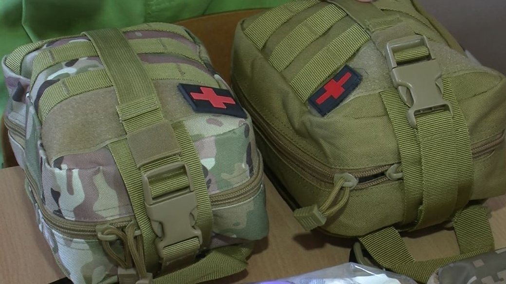 З її слів, в аптечку складають рукавички, ножиці, перев’язувальний матеріал, косинку, ковдру, серветки (гігієнічні і спиртові), бетадин, перев’язувальний набір, пов’язки для ока, пластир, а також знеболювальні, антибіотики, протизапальні ліки для звичайного користування, індивідуальний пакет при пораненні.Сформовані аптечки для бійців різняться за кольором і розмірами, але не за вмістом медикаментів. Аптечки можуть кріпитися до пояса, плитоноски чи бронежилета, розповів студент і волонтер Віктор Пастрик.