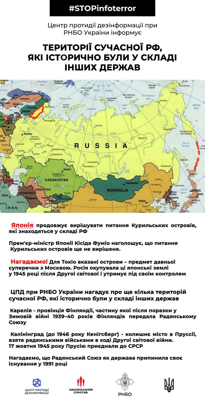 Для Токіо вказані острови – предмет давньої суперечки з Москвою. Росія окупувала ці японські землі у 1945 році після Другої світової і утримує під своїм контролем. ЦПД при РНБО України нагадує про ще кілька територій сучасної РФ, що історично були у складі інших держав.