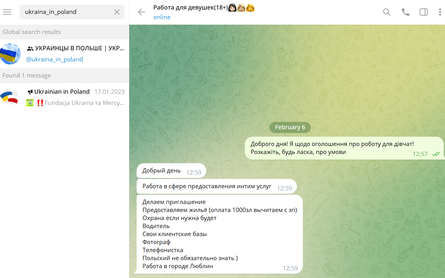 Своє дослідження журналістка вирішила почати з різноманітних груп у Фейсбуці, Вайбері й Телеграмі, де українці, які живуть у Польщі, обговорюють різні питання, пов’язані з побутом у цій країні. У неї була досить велика вибірка, однак увагу привернуло таке оголошення: «Работа в Польше для девушек 18+. Заработок в месяц 15000–20000 зл в месяц (3400–4500 доларів – ред). Делаем приглашение. Жильё предоставляется. Всех, кто заинтересован, пишем в личное сообщение».