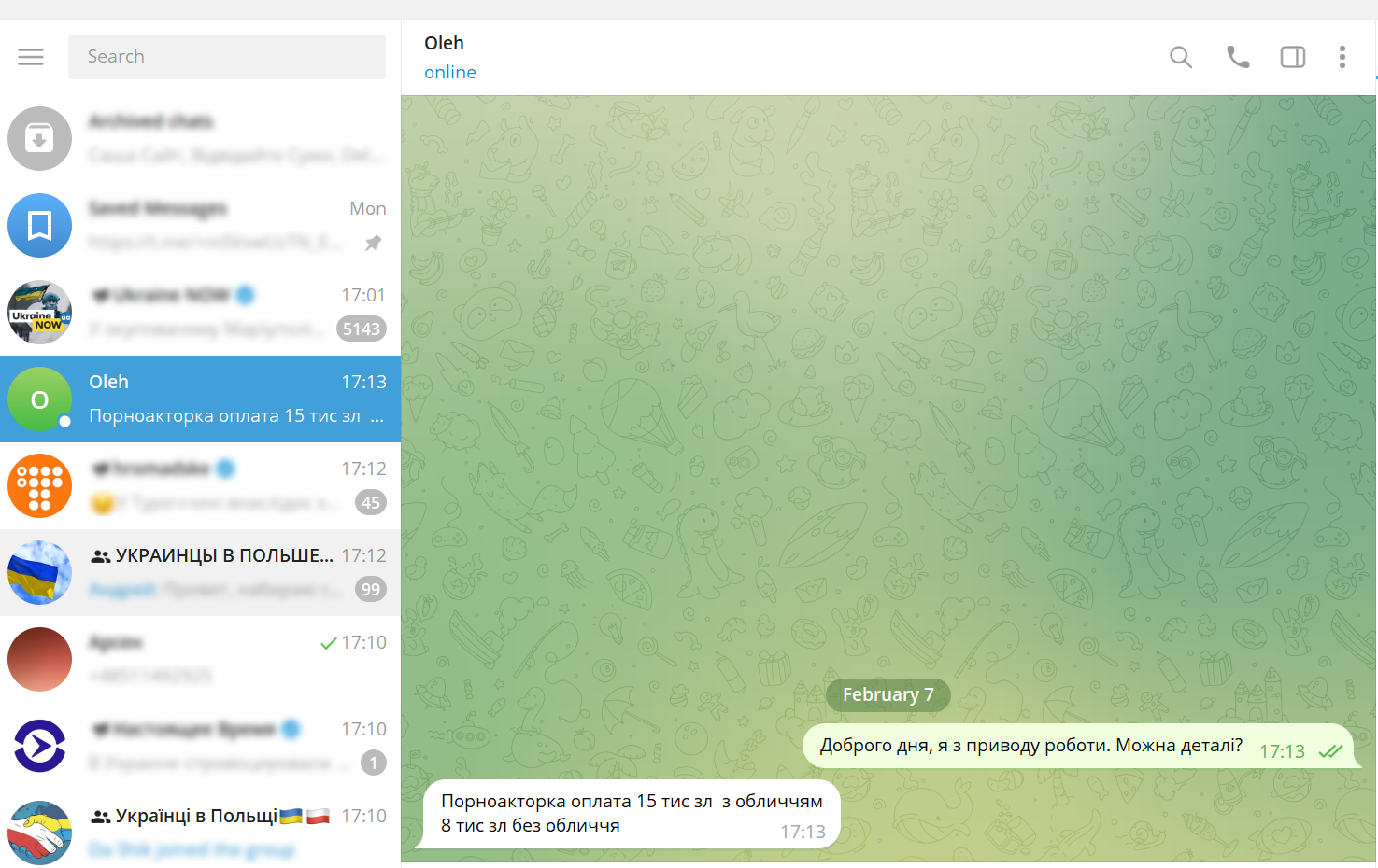 Зважаючи на те, що середня зарплата в Польщі, за даними Центрального статистичного офісу Польщі (GUS), становить трохи більш ніж 5300 злотих на місяць (1200 доларів), запропонована сума видається космічною. Тож я вирішила розпитати, за що дають такі гроші. У відповідь одразу відповіли: «інтимні послуги». На додачу до «вакансії» запропонували фотографа, водія, телефоністку й базу з клієнтами.