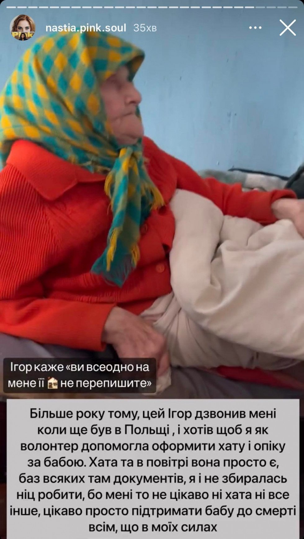 До слова, ні хата, ні земля не оформлені. Особисто мені це геть не цікаво, тому цим займатись не буду. Мені цікаво подивитися в очі людям (вони ж мені в батьки годяться), які поливають брудом мене зараз. Що ви скажете, коли бабусі не стане, а хата залишиться там, де і була? Які тоді звинувачення будуть у мій бік?Ще ніколи не давала таких розгорнутих коментарів, бо вважала, що очевидно для всіх, наскільки складна праця волонтерів і як вони потребують підтримки, але час настав.