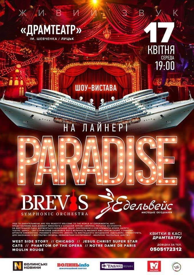 Шоу-вистава «На лайнері Paradise» відбудеться 17 квітня о 19:00 у Волинському обласному академічному музично-драматичному театрі імені Т. Г. Шевченка.