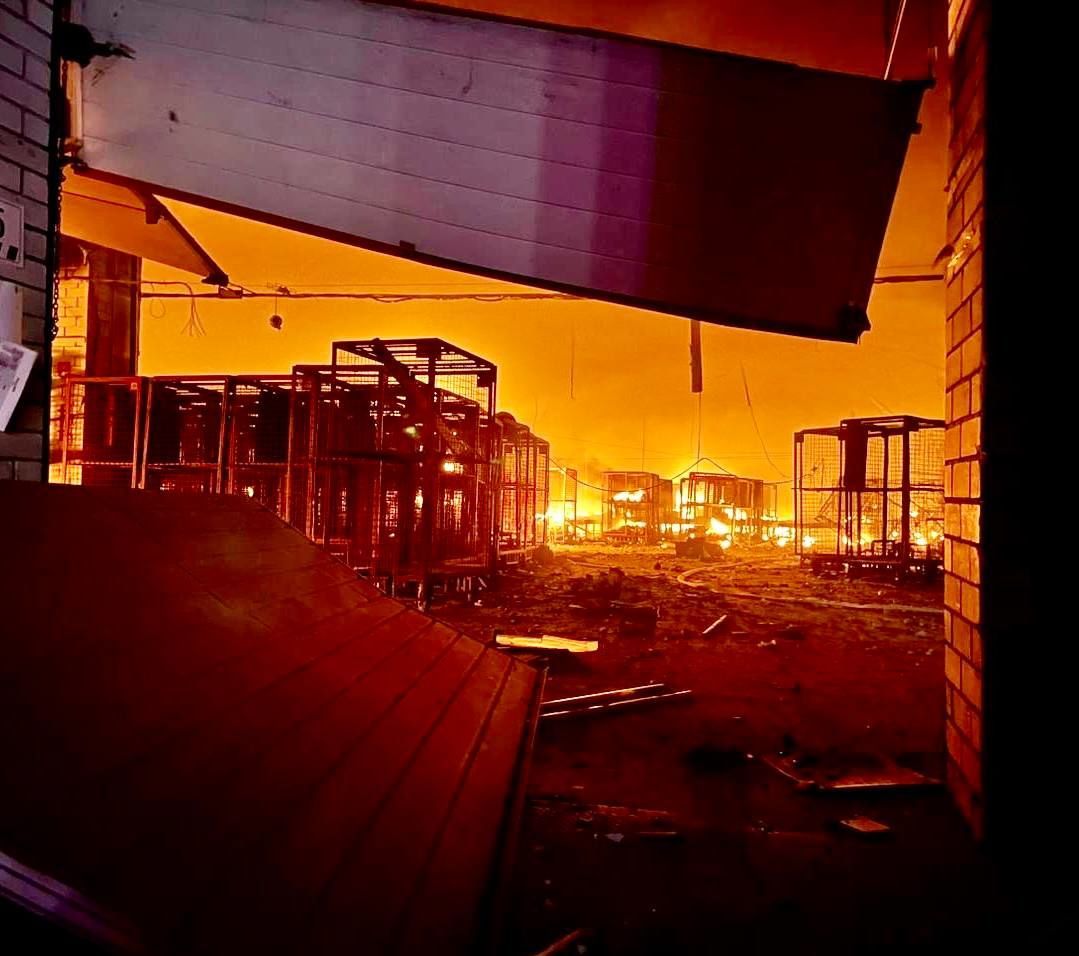 Російська атака спричинила масштабну пожежу. Вогонь спалахнув на площі понад три тисячі квадратних метрів. Було зруйновано склади підприємства.