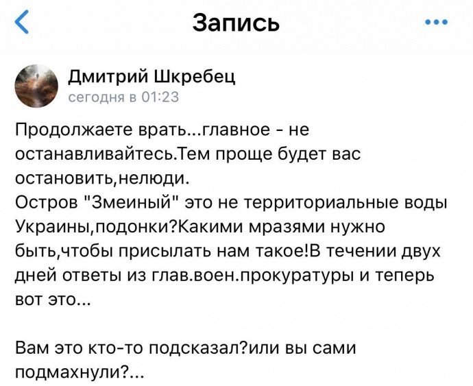 «Острів Зміїний – це не територіальні води України, покидьки? Якими мерзотами треба бути, щоб надсилати нам таке!» – обурюється чоловік.