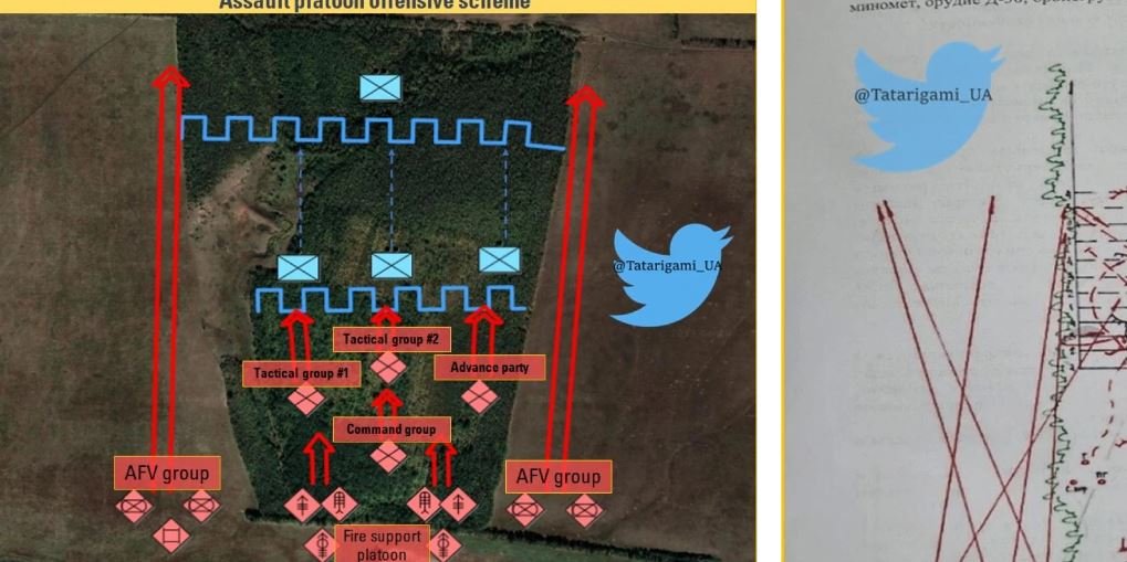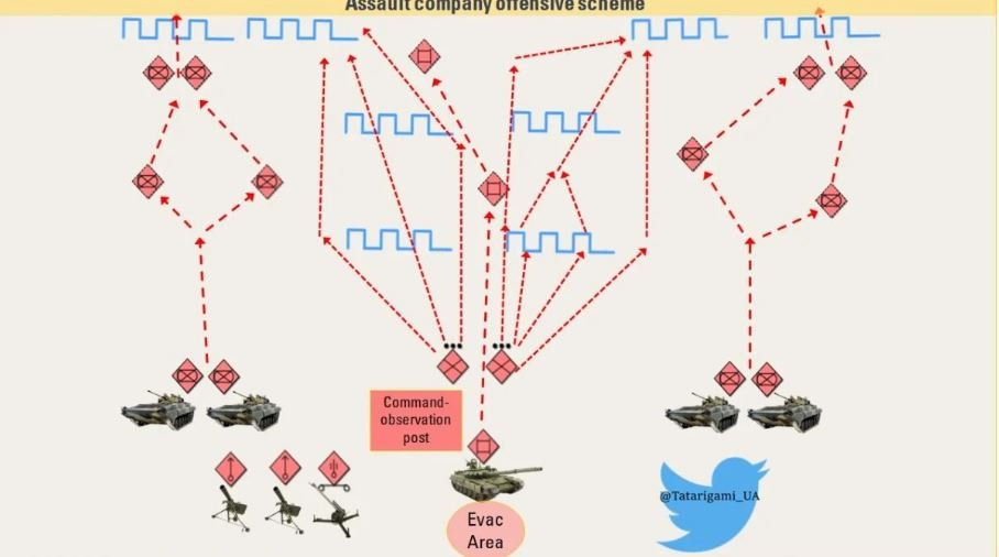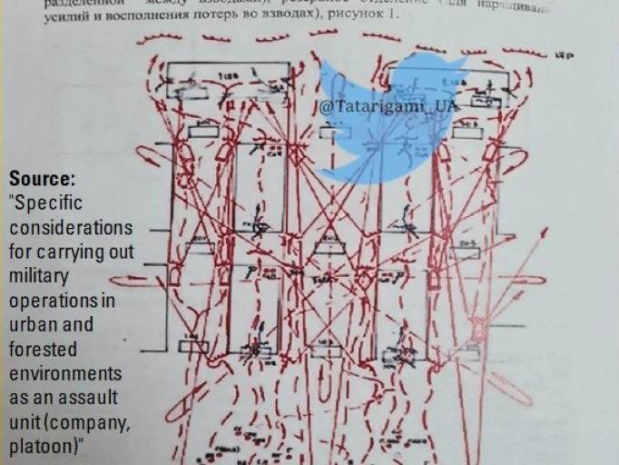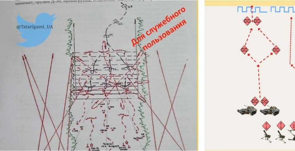 Напередодні український офіцер запасу із ніком Tatarigami_UA в Twitter опублікував серію фото російського посібника. У посібнику, що потрапив до рук українських військових, описується тактика «штурмового загону». Це підрозділ розміром з батальйон, оптимізований для фронтальних атак на укріплені райони. У складі загону – шість танків Т-72, 12 БМП, набір переносних термобаричних ракетних установок, протитанкових керованих ракетних комплексів, буксируваної артилерії і самохідних мінометів. Основними маневреними елементами з’єднання є штурмові «взводи» по 12-15 чоловік, розбиті на тактичні групи по три людини.Аналітики заважують, що описана тактика спрямована на захист передусім бойових танків, яких росіяни втратили у війні проти України більше 3 тисяч, а не життів військових.