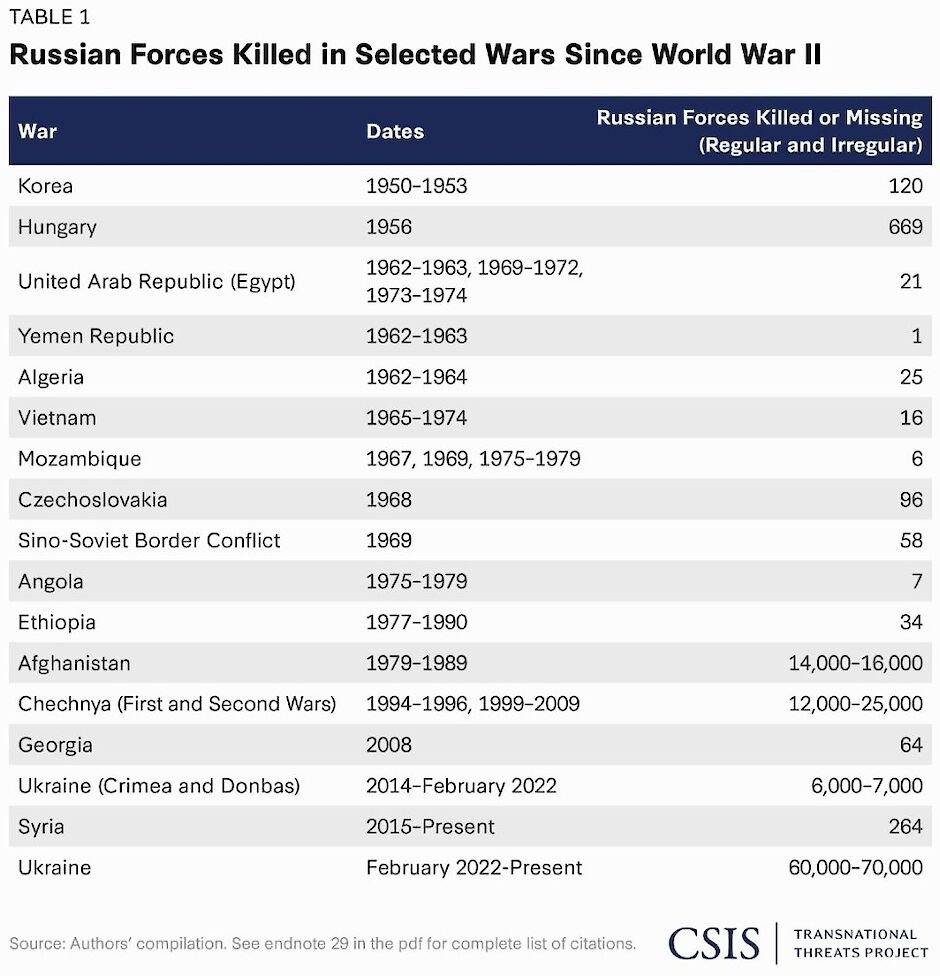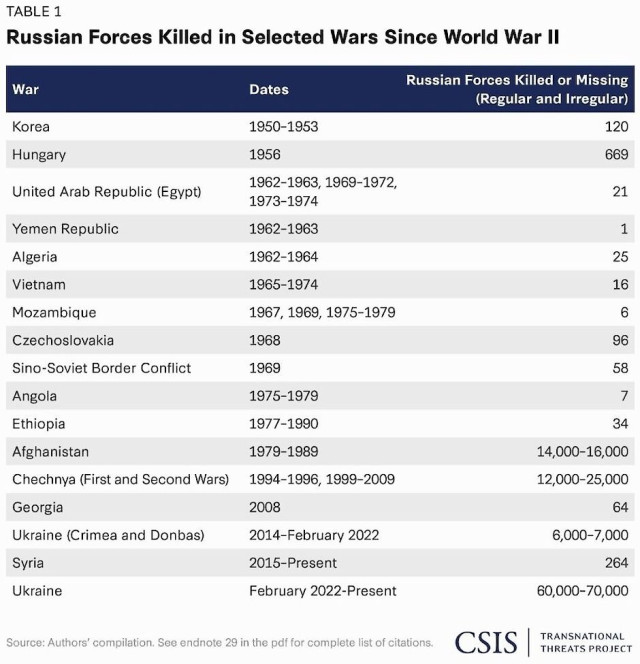 Доповідь CSIS також зазначає, що найбільше після Другої світової війни російські та радянські військові загинули в Афганістані (14-16 тисяч) і Чечні (12-25 тисяч), а до повномасштабного вторгнення в Україну під час боїв на Донбасі (6-7 тисяч) втрати були більш помірними.При цьому темпи втрат тільки зростають і перевищили всі попередні військові конфлікти. У Чечні росіяни втрачали до 185 осіб на місяць, в Афганістані – до 145. Зараз же в Україні втрати росіян можуть доходити до 5 тис. осіб щомісяця.