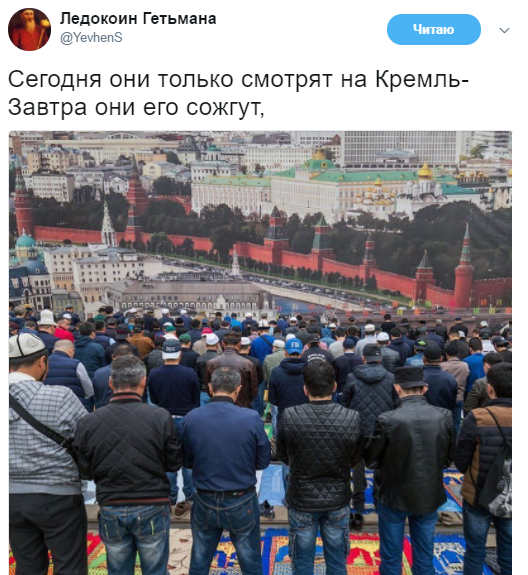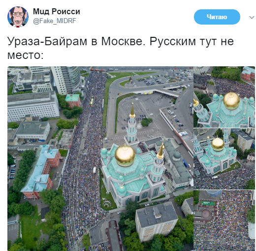 "Ураза-Байрам у Москві. Росіянам тут не місце", - йдеться на підписи до фото, на яких видно безліч вірян.