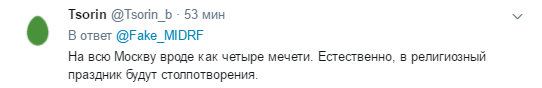 "На всю Москву ніби як чотири мечеті. Природно, в релігійне свято будуть стовпотворіння", - зазначив Tsorin.