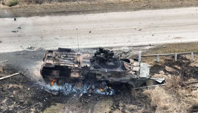 Також Сили оборони України знищили 9109 (+12) російських танків, бойових броньованих машин ‒ 18332 (+45), артилерійських систем – 19782 (+29), РСЗВ – 1240 (+2), засобів ППО ‒ 984 (+2), літаків – 369 (+0), гелікоптерів – 329 (+0), БПЛА оперативно-тактичного рівня – 17726 (+56), крилатих ракет ‒ 2625 (+0), кораблів / катерів ‒ 28 (+0), підводних човнів ‒ 1 (+0), автомобільної техніки та автоцистерн – 27460 (+95), спеціальної техніки ‒ 3541 (+6).