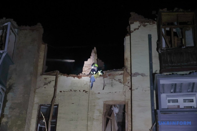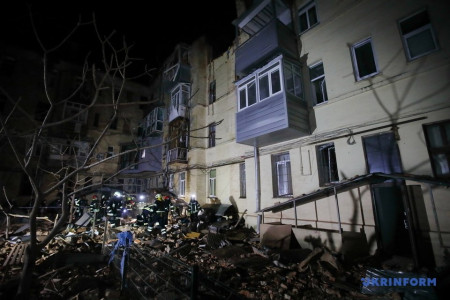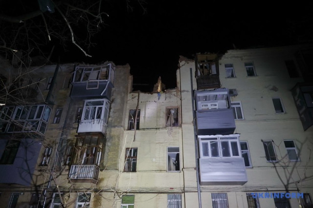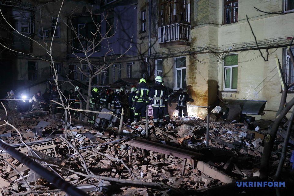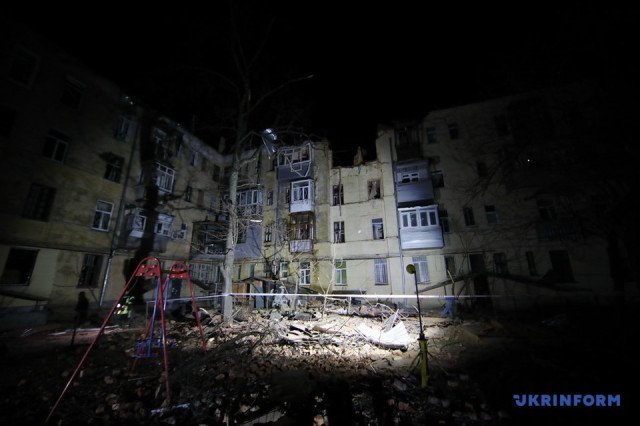 Внаслідок російського обстрілу центру Харкова повністю зруйнований четвертий поверх одного з під’їздів будинку в Київському районі міста.