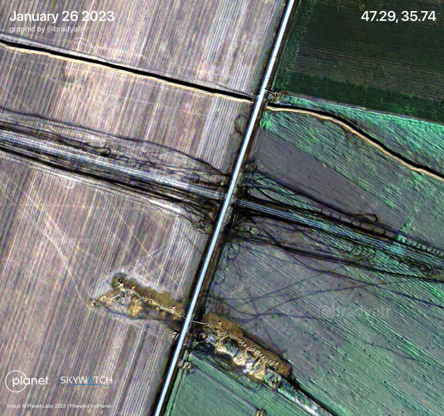 OSINT-аналітик також вносить інформацію, одержану із супутникових знімків, на карту. За його даними, ситуація з окопами росіян зараз виглядає так:Російські війська в окупованому Бердянську укріпили аеропорт окопами та «зубами дракона». Фото: Brady AfrickРосійська оборона споруджена біля Михайлівки Запорізької області. Фото: Brady Africk.Російські війська в окупованому Токмаку укріпили місто окопами та «зубами дракона». Фото: Brady Africk.