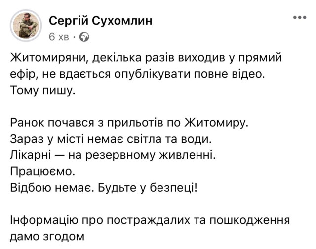 Мер Житомира Сергій Сухомлин повідомив, що у місті після прильотів по енергетичній інфраструктурі немає ані електрики, ані води.