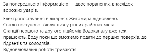 Мер Житомира Сергій Сухомлин повідомив, що у місті після прильотів по енергетичній інфраструктурі немає ані електрики, ані води.